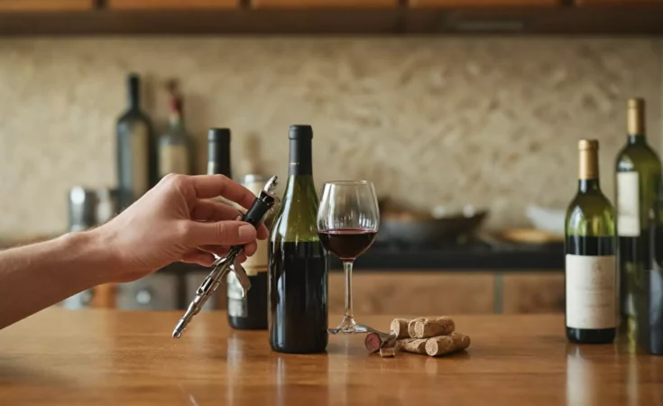 Skorzystaj z odpowiednich narzędzi: korkociąg typu sommeliera (waiter’s friend), nóż do folii, ewentualnie korkociąg z dźwignią lub Ah-So do starych korków. Przy winach musujących przygotuj ręcznik i odczekaj chwilę, aby nie otwierać butelki gwałtownie.
